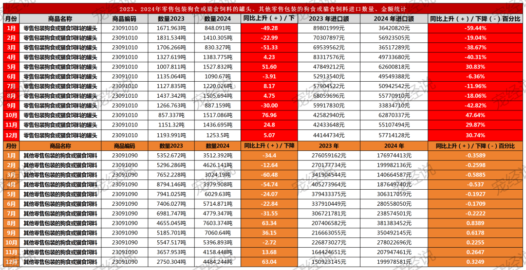 具体到零售包拆狗食或猫食饲料的罐头进口金额中,有8个月呈现下滑姿势,此中1月份同比下滑-59。44%,幅度为全年最大。值得一提的是,虽零售包拆狗食或猫食饲料的罐头的进口金额大都月呈现下滑姿势,但以数量来看,只要5个月呈现下滑,其余均为上升姿势。而正在其他零售包拆的狗食或猫食饲料的进口金额中,则为3月份下滑最为严沉,下滑比例为-58。85%,8月后全体环境起头大幅度回暖。但全体环境对比2023年照旧下滑严沉。正在其他零售包拆的狗食或猫食饲料的合计量中,也有8个月呈现较着下滑。